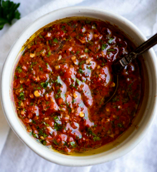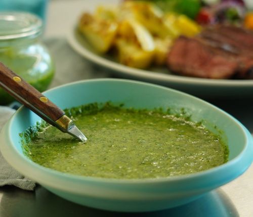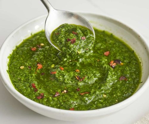 Chimichurri is a vibrant, uncooked, green herb sauce originating from Argentina and Uruguay, commonly served with grilled meats, particularly steak. It is oil-based, blending finely chopped coriander, garlic, oregano, red wine vinegar and red pepper flakes for a tangy, herby flavor.