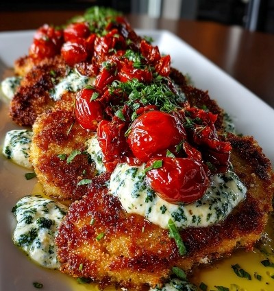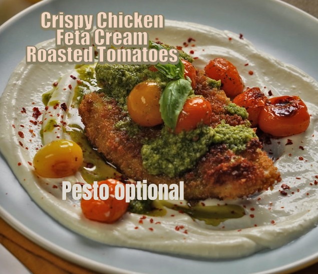 Fancy or plain, this versatile crispy chicken features a feta cream topping or side serving in a delicate dressing with optional pesto.