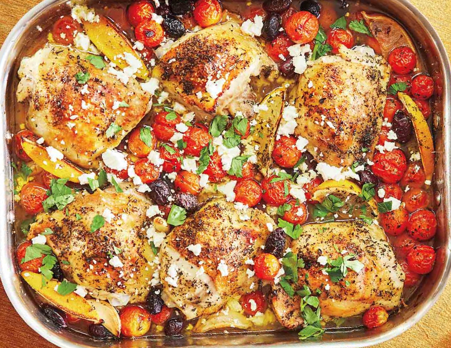 6. Bake chicken and tomatoes for 20–25 minutes until chicken is golden and cooked through and tomatoes are softened and slightly blistered.