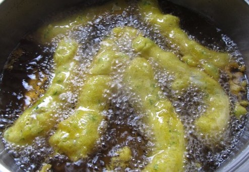 Before frying, we place a plate with flour, coat the fish in it, then in the batter, and into the hot oil, medium heat so that it cooks inside and out without getting burnt.