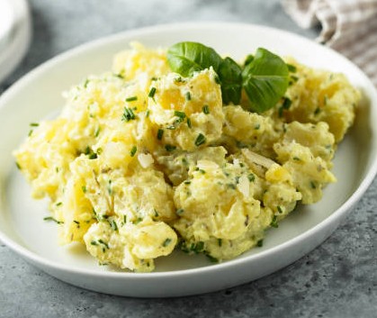 German potato salad (Kartoffelsalat) is a classic of German cuisine, very different from Russian potato salad. Typically served with Fish Churros in Tenerife.