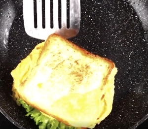 All cooked in one pan, deliciously crisp and melty bacon and egg toasty with cheese – the perfect breakfast. Lettuce and tomatoes optional.