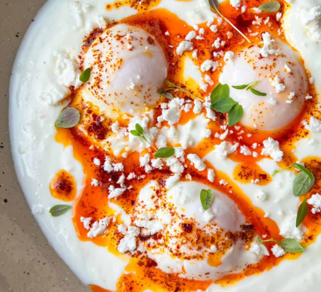 A versatile savory dish originally based on Cilbir (Turkish Eggs) with boiled or poached eggs, peppers optional, served over a delicious garlicky yogurt and topped with cheese. Enjoy with fresh bread,